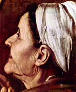 È notte in quel vicolo popolare di Roma, lontani dal fasto dei palazzi rinascimentali e delle piazze barocche. Due vecchi, un uomo e una donna, sono lì, davanti a una porta che si apre per loro, una porta dall’intonaco scrostato, con alcune crepe ben visibili. La porta di una casa povera si schiude di notte a due sconosciuti sporchi e stracciati che chiedono forse un po’ di cibo, o dell’acqua o ospitalità. Ed ecco, si affaccia una donna bellissima, vestita umilmente come una donna del popolo, che tiene in braccio un bambino non più piccolissimo. Una Madonna semplice, molto distante dall’iconografia tradizionale, che porta i capelli castani raccolti, senza velo, senza il manto azzurro, senza nessun ornamento sul capo se non una sottilissima quasi invisibile aureola. Niente a che fare con la Vergine incoronata di stelle che siede in un trono luminoso, in un tripudio di angeli e di santi altrettanto luminosi. È scalza e poggia il piede leggerissimo sul pavimento dell’uscio, sporgendo in fuori la testa con sguardo benevolo, mentre il bimbo sorride, indicando con il dito i due pellegrini. Una Madonna col suo Bambino che incontra fisicamente i viandanti. Non più l’umano che si protende verso un Divino lontano, ma il Divino che si china, che rivolge i suoi occhi, che apre la porta all’umanità più umile e affaticata. Osserviamo questi due ignoti visitatori: ci colpisce subito il particolare dei piedi scalzi, gonfi e sporchi dell’uomo, che tanta strada ha percorso per giungere proprio fino a lì, con i pantaloni rattoppati e consunti. La donna ha il viso e le mani raggrinzite dall’età e dalle fatiche della vita quotidiana e la cuffia che porta in capo è anch’essa sdrucita, dopo aver perduto l’originale candore. Il bastone li identifica come pellegrini venuti da molto lontano: chi e che cosa sono venuti a cercare? Una chiesa sontuosa rivestita di marmi multicolori e di mosaici dorati? Le reliquie dei santi rinchiuse in urne preziose? Statue rivestite di gioielli e illuminate dallo scintillare di luci e candele? Processioni di uomini dai lussuosi paramenti avvolti da nuvole di incensi orientali? No, come i pastori davanti alla povera grotta di Betlemme, il viaggio si ferma lì, davanti a questa donna semplice e naturalmente luminosa, che regge quasi con fatica il bimbo coperto unicamente da un candidissimo lenzuolo. Solo la semplicità di chi si sente creatura bisognosa di accoglienza, di attenzioni, addolorata forse per le troppe porte rimaste chiuse davanti alla richiesta d’aiuto nella notte di un luogo ostile e sconosciuto, solo lei permette al Divino di rivelarsi, di farsi riconoscere e di colmare la sete di amore che è nel cuore di ciascuno di noi. Il resto è Luce: è luce che accarezza le figure, le fa emergere dall’oscurità, le plasma nella loro fisicità. Ed è una luce che non viene dall’alto, ma dal volto della donna, dal corpo del bambinello, da quel bianco lenzuolo… lo stesso forse che lo avvolgerà tanti anni dopo, deposto dalla croce. Solo il genio di Caravaggio ha potuto raffigurare in modo tanto commovente l’incontro con Dio del pellegrino e della pellegrina cercatori di luce. Lui, il pittore assassino e fuggiasco che vive ai margini della città, che ne frequenta i bassifondi, che, raffigurando la morte della Vergine, si serve del corpo gonfio di una povera donna del popolo, una prostituta annegata nel Tevere. Lui, il genio che, attingendo al buio del suo cuore, col pennello lo trasforma nella Luce più pura e luminosa che la pittura ci abbia mai donato. E sarebbe davvero un momento di intensa spiritualità se noi, prossimi pellegrini del giubileo, sostassimo davanti alla Madonna dei Pellegrini custodita nella chiesa di S. Agostino centralissima eppure lontana dalle folle e anche noi, come i due viandanti, incontrassimo il Divino nell’umiltà, nel silenzio, nella semplicità. Una piccola porta disadorna si trasformerà così nella nostra personale Porta del Paradiso.
