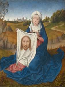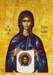 Perché tutte le testimonianze dei primi Giubilei sono concordi nel porre al primo posto fra le aspirazioni dei pellegrini, una volta raggiunta Roma, quella di poter finalmente vedere con i propri occhi la Veronica, di inginocchiarsi, di pregare davanti ad essa? Perché Dante, lui stesso pellegrino del primo grande Giubileo del 1300, canta la commozione del pellegrino venuto dalla lontana Croazia davanti al telo con impresso il volto di Cristo che è stata forse la sua stessa commozione? Perché ancora ci emoziona il vecchierello bianco e stanco di Petrarca che abbandona casa e famiglia per un viaggio senza ritorno, con la speranza di adorare la Veronica? E ce ne parla anche il grande narratore inglese Geoffrey Chaucer nei suoi Racconti di Canterbury: fra i viandanti, alloggiati in un’osteria durante il pellegrinaggio alla tomba del santo vescovo Thomas Becket nella cattedrale di Canterbury, ne spicca uno. “Era scarmigliato. Salvo per il berretto la sua testa era nuda… Una Veronica era cucita sul suo berretto, la sua bisaccia era posata davanti al suo grembo, piena fino all’orlo di indulgenze dall’antico seggio di Roma”. La Veronica fin dal 1300 era diventata il simbolo del pellegrino giubilare, tanto da porre l’immagine sul cappello, così come la conchiglia lo era per i pellegrini del Cammino di Santiago, prima che, più tardi essa fosse sostituita dalle due chiavi petrine. Per gli antichi pellegrini, anche malati, deboli, sofferenti, contemplare la Veronica ripeteva il gesto dei tanti ultimi, delle tante ultime che nei Vangeli cercano il contatto di Cristo, sperando anche solo in uno sguardo benevolo e guaritore del corpo e dell’anima. Tanto popolare quanto misteriosa, la Veronica. Da molto tempo si sono perdute le sue tracce: è molto probabile che la reliquia sia stata distrutta durante il terribile Sacco di Roma del 1527, quando anche la Basilica di S. Pietro venne saccheggiata dai lanzichenecchi che avevano aderito alla Riforma protestante. C’è, però, chi sostiene che ancora essa sia in salvo, nascosta dentro una delle grandi colonne della Basilica, forse proprio all’interno del basamento della colossale statua in marmo, realizzata dallo scultore Francesco Mochi, fra il 1635 e il 1639, in cui Veronica, in movimento, con le vesti scompigliate e con forte enfasi, mostra il velo con l’impronta del Santo Volto. Storia, leggenda, tradizione, in cui il nome della reliquia si identifica col nome dell’altrettanto misteriosa donna che, unica a saper vedere con gli occhi della pietà la sofferenza di Cristo sulla via del Calvario, si fa largo fra la folla di soldati e curiosi, per asciugare quel volto sanguinante: e quel volto rimarrà per sempre impresso sul bianco telo. Talmente radicata nella devozione popolare che è raffigurata nella sesta stazione della Via Crucis. Immagine del coraggio, della gentilezza d’animo, del prendersi cura propria delle donne; perfino nel gioco del calcio, un particolare tipo di dribbling in cui un giocatore inganna e supera l’avversario è chiamato “veronica”; e ancora oggi il nome è portato da donne e bambine. Figura amatissima dagli artisti di tutta l’Europa orientale e occidentale, particolarmente dai pittori che ci hanno lasciato splendidi capolavori. Un’antica icona bizantina ci mostra il volto giovane e bello di questa donna ingioiellata, con i capelli acconciati, vestita con un manto di un brillante azzurro che splende sullo sfondo oro. L’azzurro mette in particolare risalto il bianco telo, in cui il volto di Cristo, più che sofferente e sanguinante, appare con la serenità del Risorto già cinto di un’aureola dorata. Nelle ricche Fiandre del 1400 il pittore Hans Memling dipinge la sua dolce pensosa Veronica: sullo sfondo di una Gerusalemme dalle tante torri e di un placido paesaggio, la figura, che occupa tutta la parte centrale del quadro, regge il bianco telo movimentato da morbide pieghe con il sereno, luminoso volto di Cristo. La leggenda e la tradizione popolare travalicano la storia. Ne parla anche Jacopo da Varazze nella sua duecentesca Legenda Aurea, riprendendo varie fonti molto più antiche: un giorno l’imperatore romano Tiberio fu colpito da una grave malattia. Avendo saputo che nella lontana Palestina operava un eccezionale guaritore di nome Gesù, ordinò al suo messo Volusiano di andare a cercarlo a Gerusalemme. Ma la stagione invernale ritardò la partenza di Volusiano, che giunse in Palestina quando, ormai, era troppo tardi: Gesù era stato crocifisso. Volusiano, però, non volle tornare a mani vuote. Così si mise alla ricerca dei seguaci di Gesù, per ottenere da loro almeno una reliquia del maestro. Gli venne indicata una donna, chiamata appunto Veronica, che ammise di aver conosciuto Gesù e gli raccontò una storia prodigiosa. Anni prima, quando Cristo era andato a predicare in una località lontana, le era venuta una grande nostalgia del Signore. Perciò aveva comprato un panno bianco per portarlo ad un pittore affinché questi, sulla base delle sue indicazioni, gliene facesse un ritratto. Ma proprio il giorno in cui era uscita di casa per andare dal pittore, aveva incontrato Gesù, sofferente e piegato dal peso della croce sulla via del Calvario. La commozione e la compassione la spinsero ad asciugare col bianco telo quel volto piagato che col sangue lasciò impressi i propri lineamenti. Volusiano chiese immediatamente a Veronica quel ritratto ed ella acconsentì a portarlo di persona a Tiberio, che, appena toccò la reliquia, guarì all’istante. Da quel momento il velo della Veronica rimase sempre a Roma. Sull’identità della donna si sono formulate molte ipotesi: forse per associazione col sangue asciugato, per molti essa sarebbe da identificarsi con l’emorroissa citata nel Vangelo. Una tradizione ancora precedente ci porta a Edessa, città dell’Anatolia al confine con la Siria, dove il re cristiano Abgar avrebbe ricevuto da un misterioso viandante il telo col volto di Cri